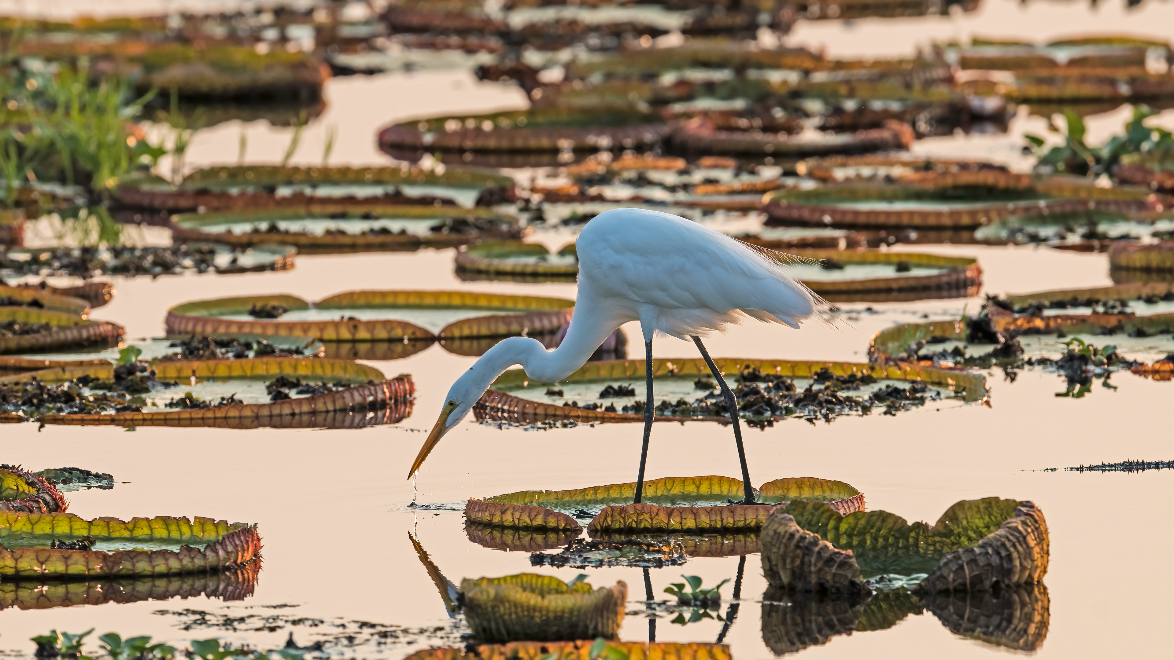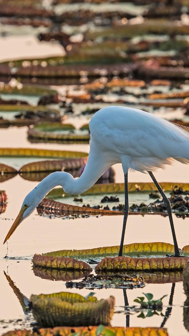 Walking carefully between the floating leaves of water lilies is a delicate white egret in the tranquil waters of the Pantanal region, Brazil. These birds can regulate their body temperature by adjusting exposure to the sun and their own wings to control body heat. They are usually monogamous, forming pairs that remain together for several breeding seasons. During mating, they perform impressive rituals, including dances and vocalisations, to strengthen the couple"s bond.