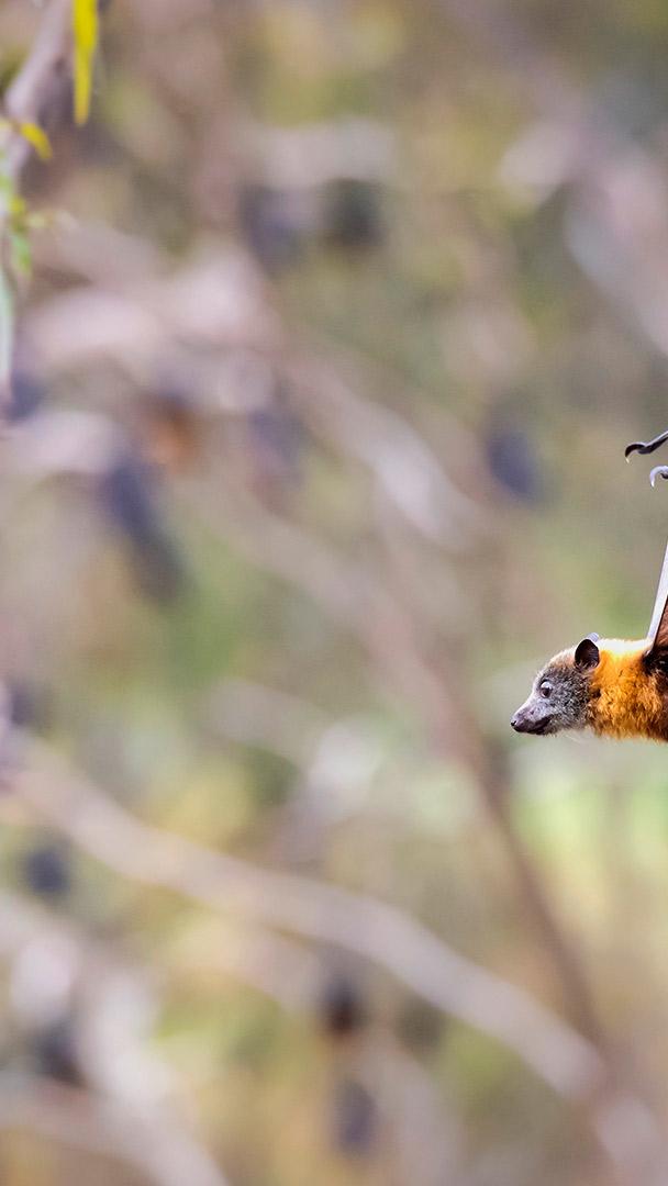 A vida em modo noturno Raposa-voadora-de-cabeça-cinzenta com filhote, Parque Yarra Bend, Austrália (© Doug Gimesy/Nature Picture Library)