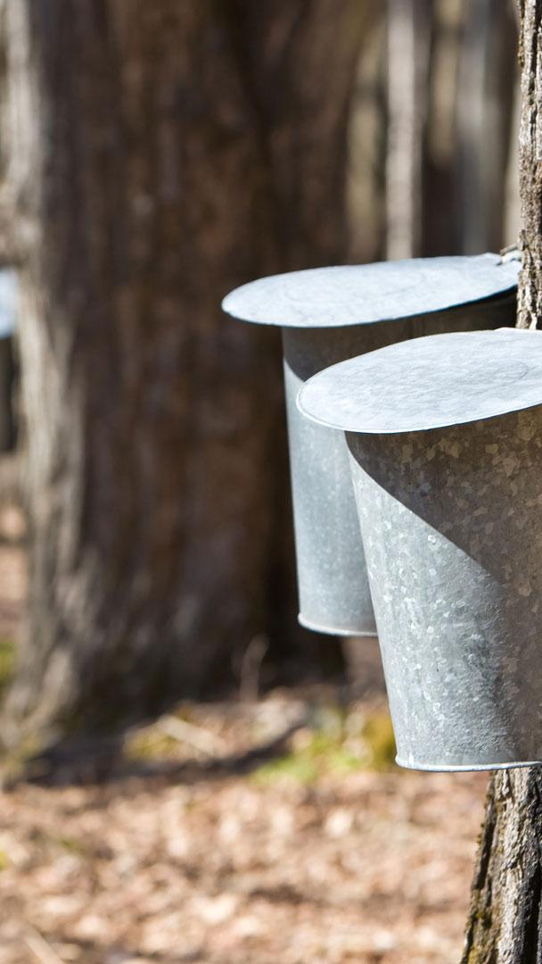 Buckets on maple trees collecting sap for maple syrup © capecodphoto/Getty Images