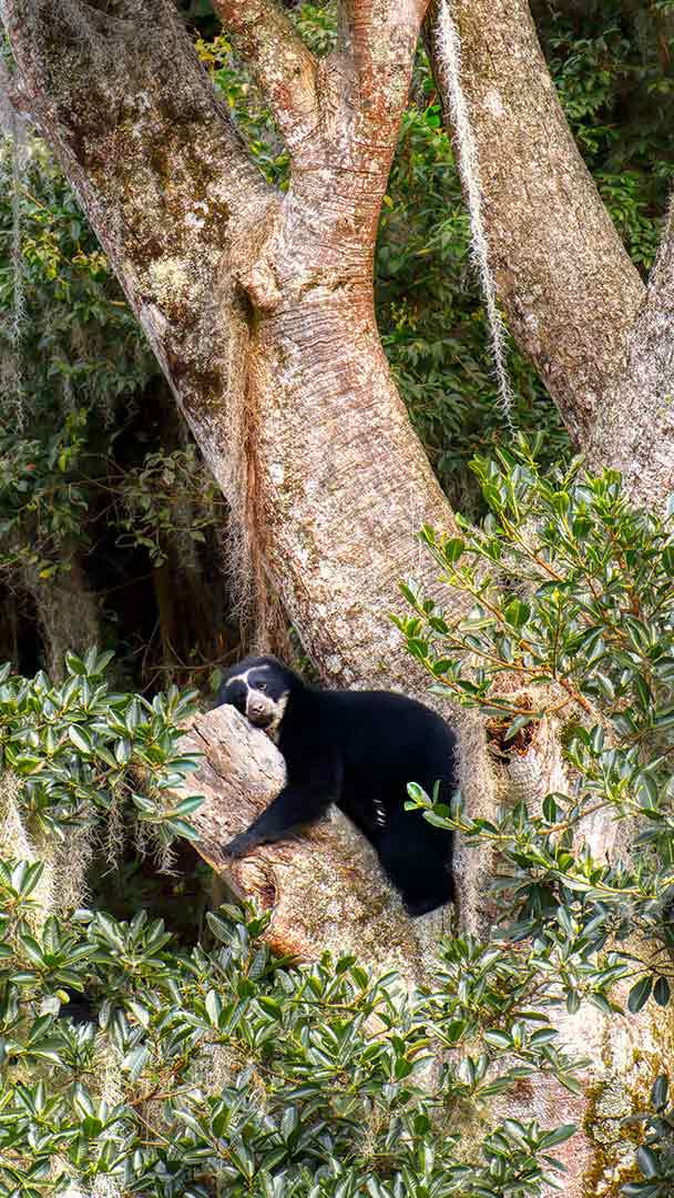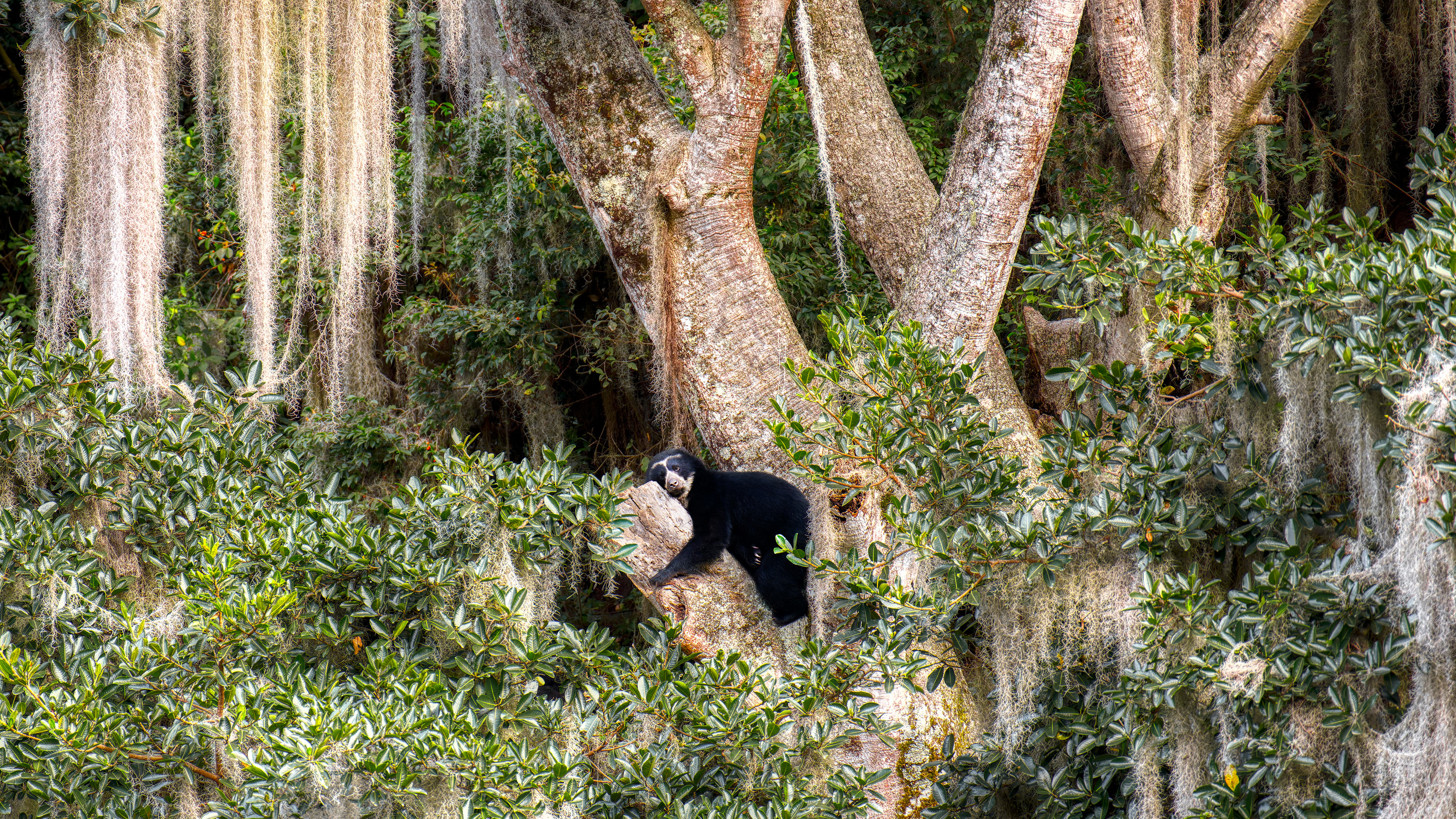 Spectacled bear resting in tree, Ecuador © Andy Rouse/Nature Picture Library