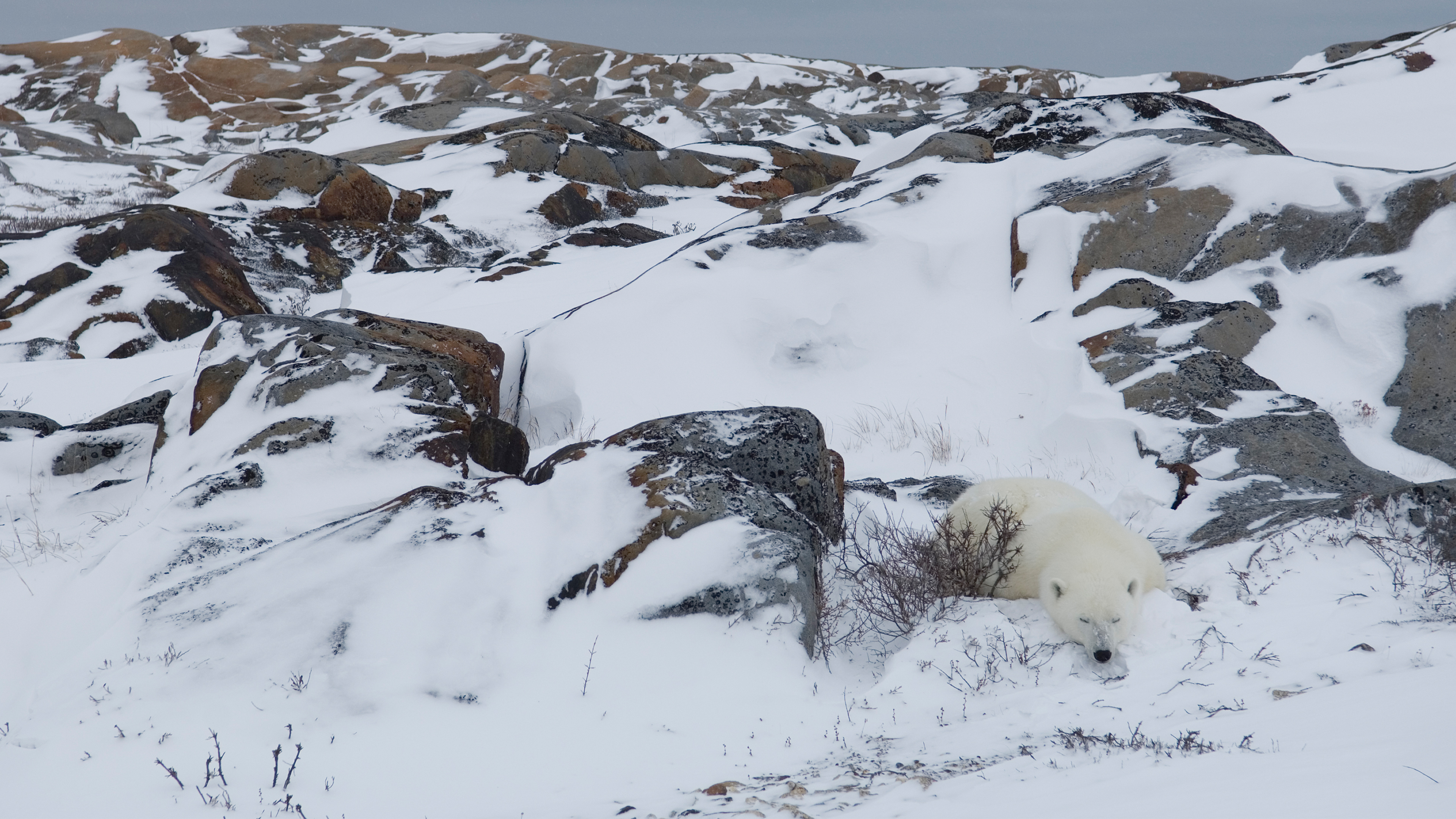 In the rugged terrain of Churchill, Manitoba, a polar bear finds solace on a bed of stone covered with ice and snow. Every year, as Hudson Bay freezes over, polar bears congregate here, waiting to return to their icy hunting grounds. The largest land carnivores, equipped with an incredible sense of smell and powerful limbs, traverse the rocky landscapes. They primarily feed on various species of seals, walruses and beluga whale. Their thick fur is perfect for insulation, and their large paws are designed like snowshoes, making them capable of surviving in the harshest of climates. A lot of globetrotters are found here during this season, paying a visit to these marine mammals, as 64 to 80 per cent of polar bears worldwide are found in Canada.