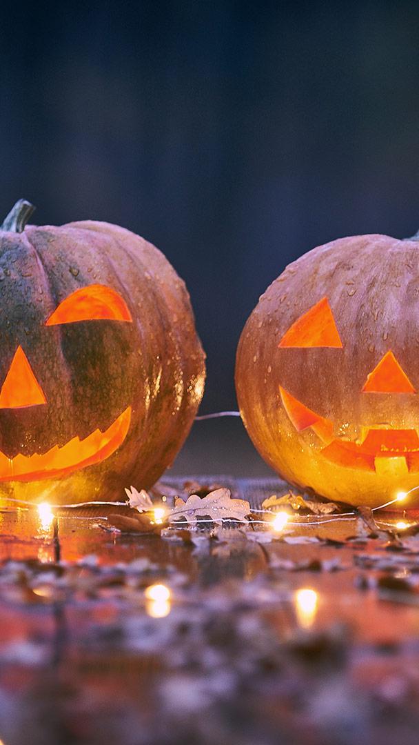 来一盏微笑的南瓜灯吗? 神秘森林里木桌上的两个微笑的万圣节南瓜 (© sandsun/Getty Images)