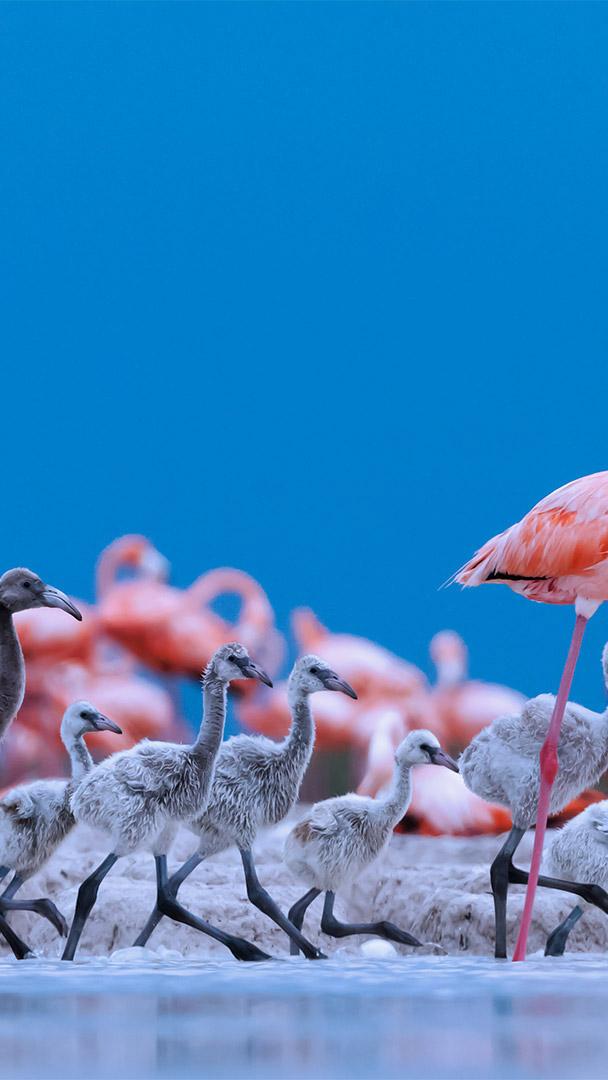 列队! 加勒比海红鹳,里奥拉加托斯自然保护区,墨西哥 (© Claudio Contreras/Minden Pictures)