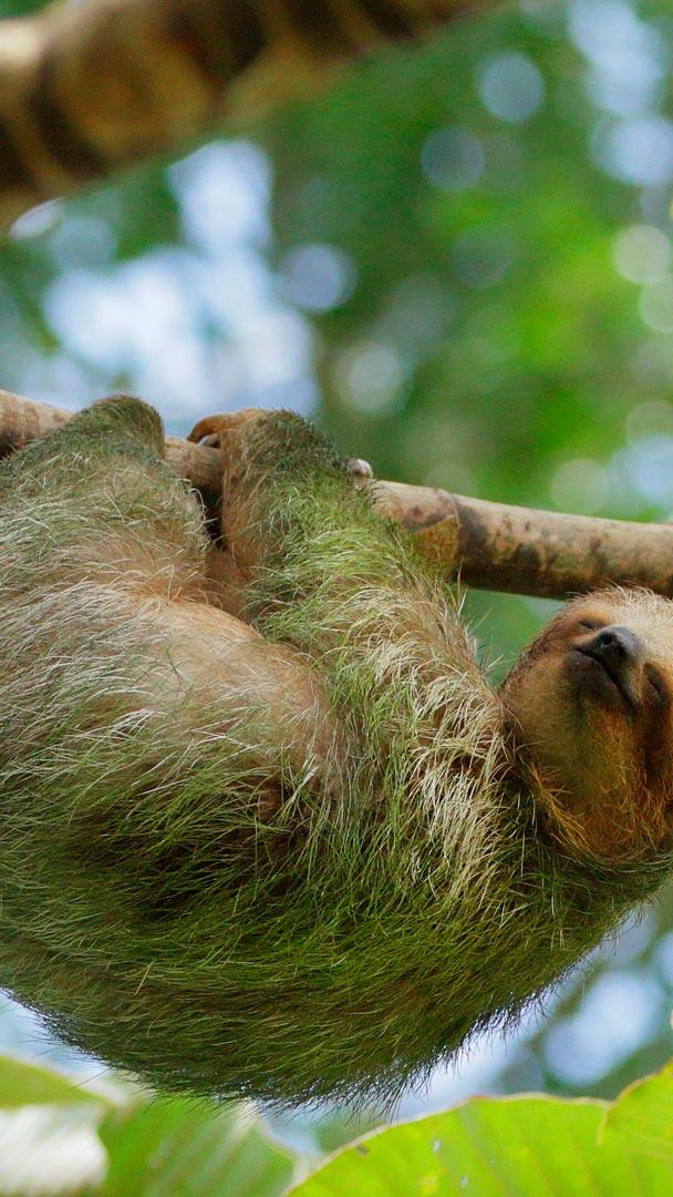 来自“颠倒世界”的问候 睡在号角树上的褐喉树懒,哥斯达黎加 (© Juan Carlos Vindas/Getty Images)