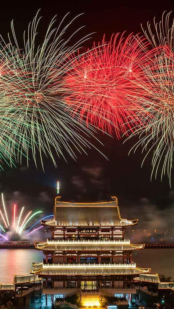 祝您阖家欢乐,万事如意! 夜空中的烟花表演,长沙,湖南省,中国 (© Sino Images/Getty Images)