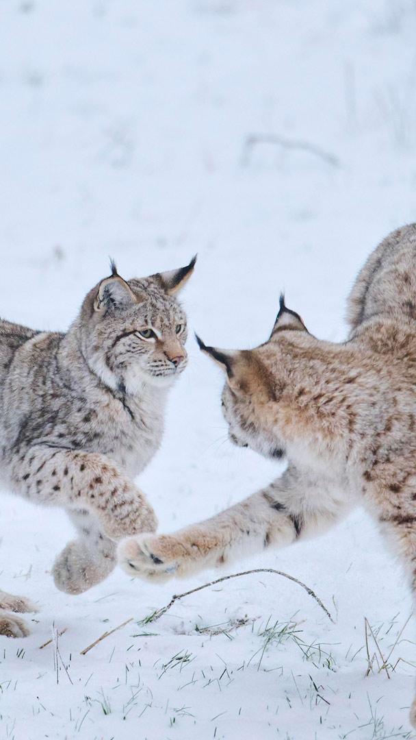 Eurasische Luchse beim Spielen im Schnee, Bayern © imagebroker/david & micha sheldon/Getty Images