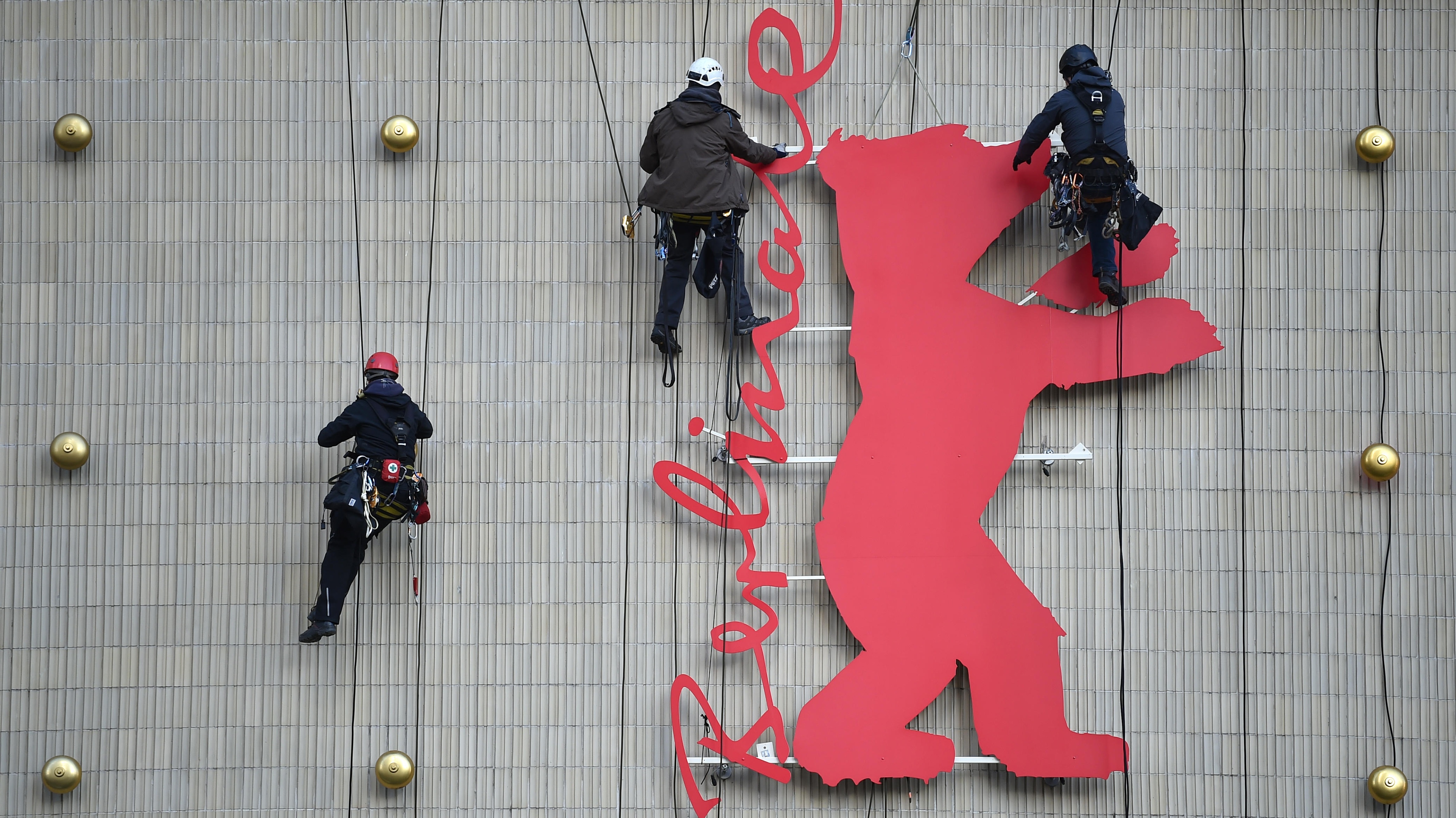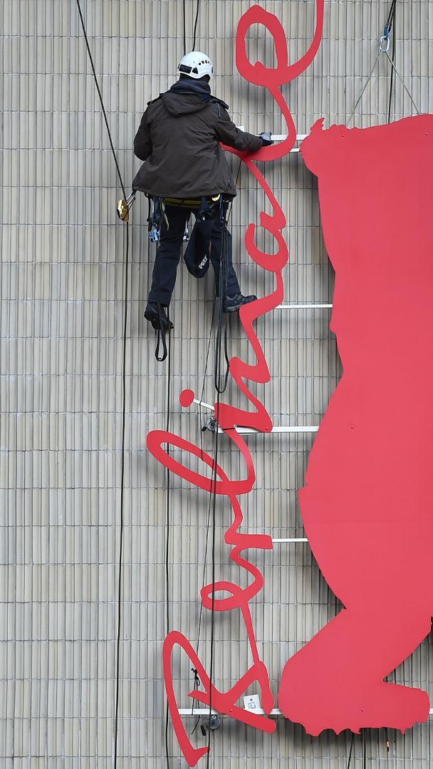 Ein Fest für den Film Industriekletterer besteigen den Berlinale-Bären im Kino Zoo-Palast, Berlin (© Britta Pedersen/dpa/Alamy Live News)