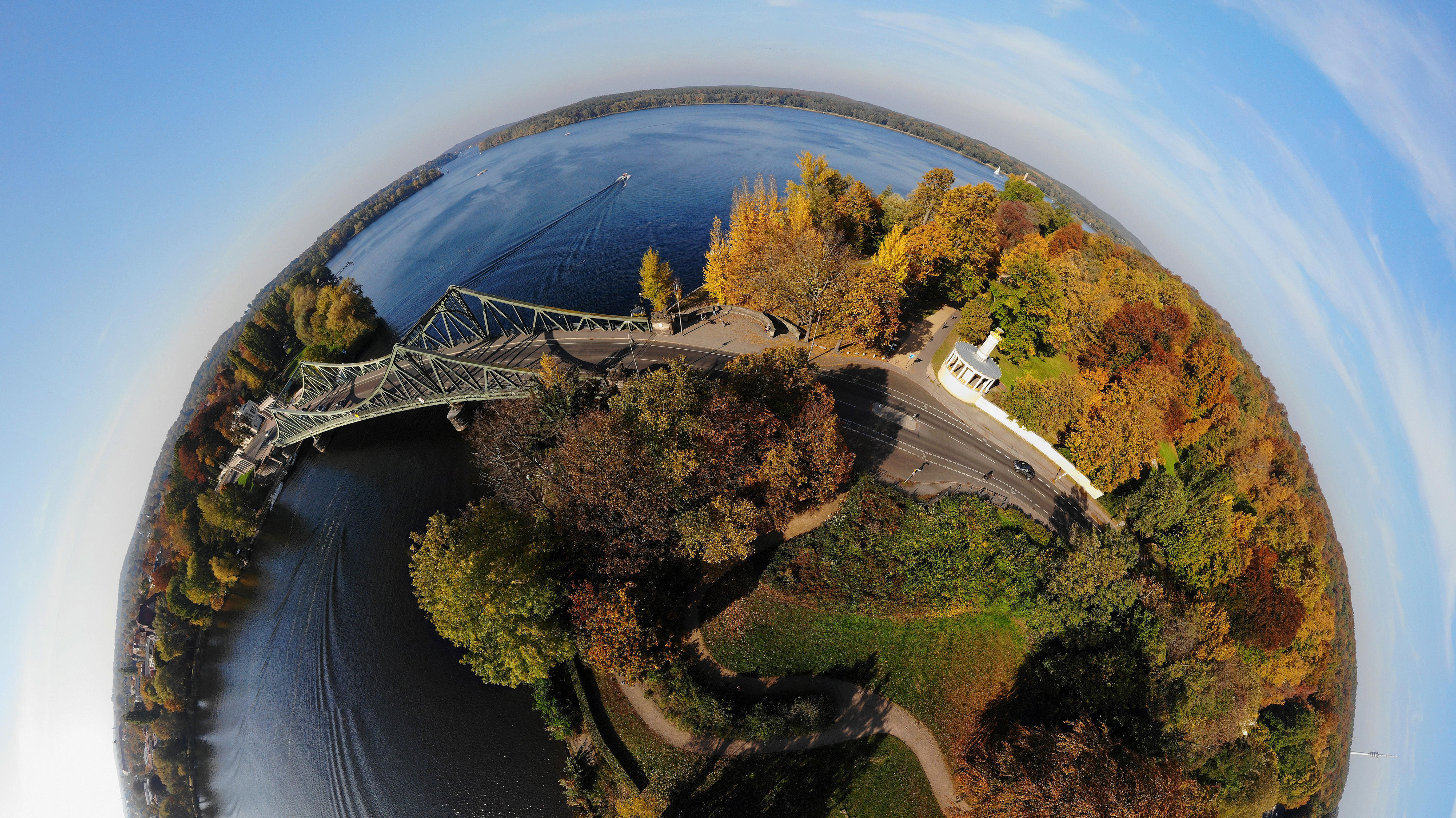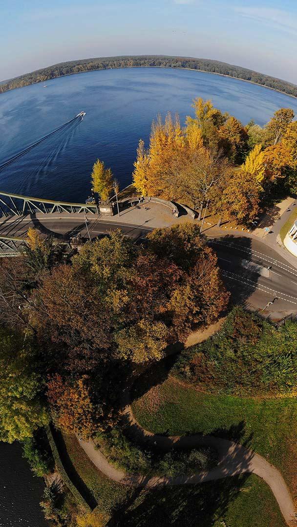 Symbol der Teilung und der Einheit Kugelpanorama-Luftbild (Little Planet) der Glienicker Brücke, Potsdam, Brandenburg (© 360b/Alamy)