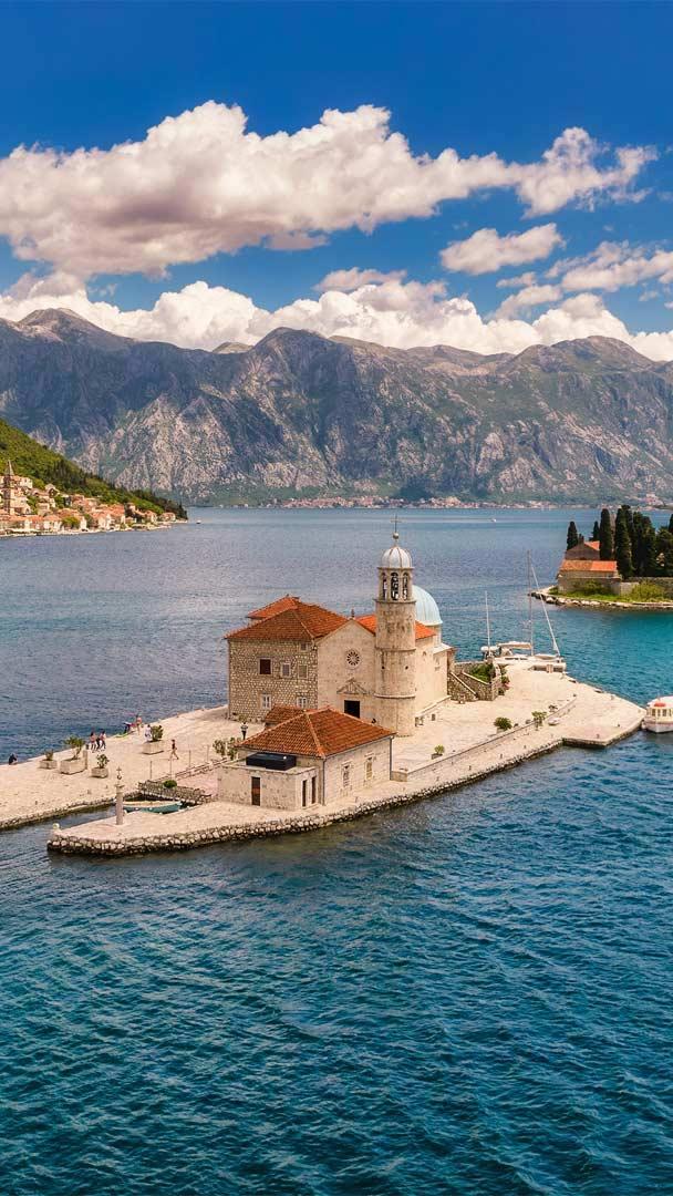 Ein Gelübde führte zum Bau dieser Insel Die beiden Inseln „Heiliger Georg“ und „Maria vom Felsen“ in der Bucht von Kotor, Perast, Montenegro (© Dmitrii Sakharov/Shutterstock)