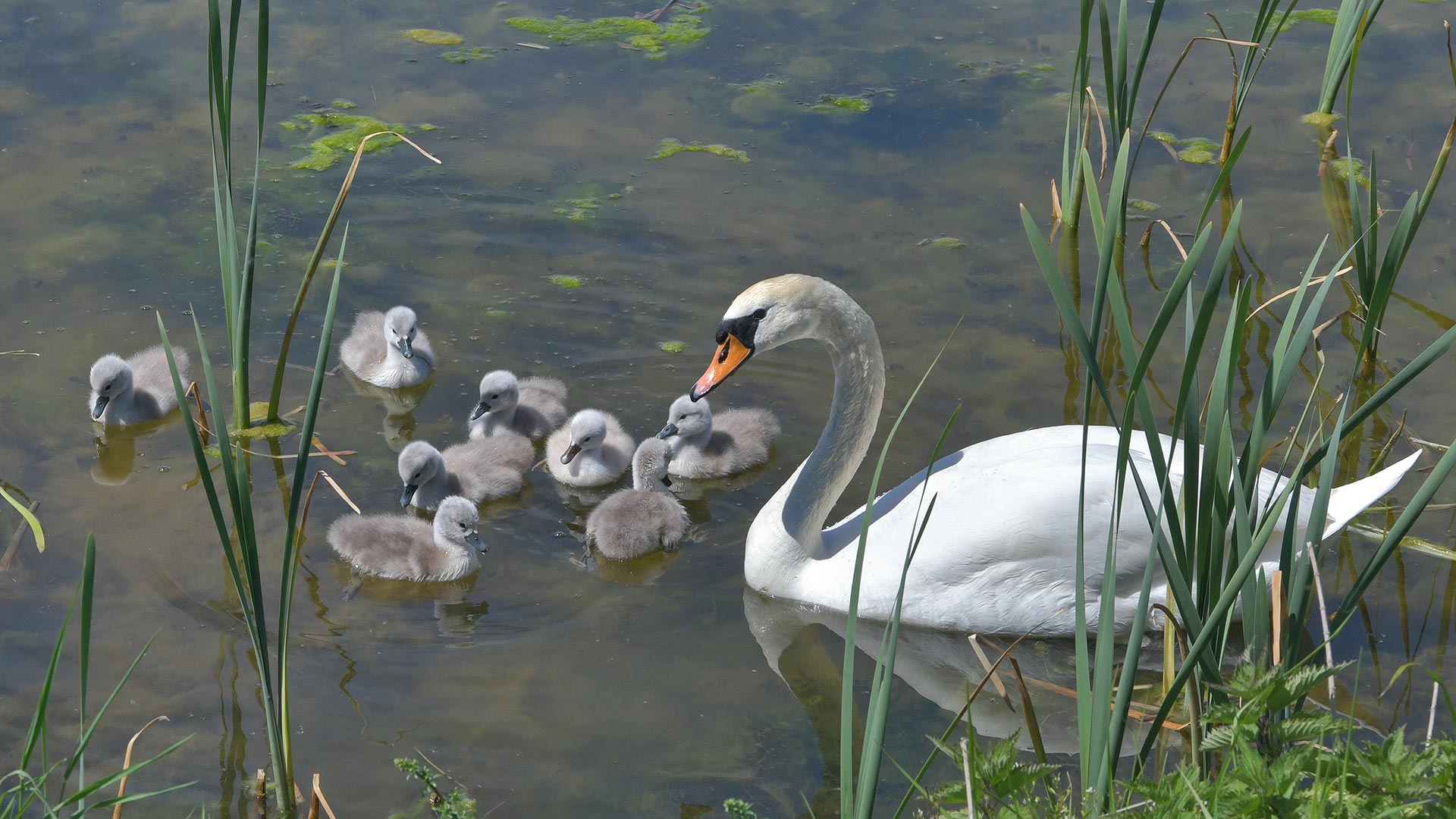 Schwimmunterricht für den Nachwuchs Schwan mit Küken, Aischgrund, Franken, Bayern (© Rüdiger Hess/geo-select FotoArt)