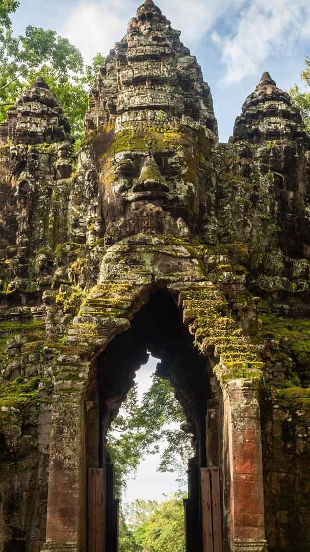 Hohe antike Tempel, moosbewachsene Ruinen und zauberhafte Wälder - all das findet man in der antiken Stätte Angkor in Kambodscha. Im 12. Jahrhundert war dieser Ort die pulsierende Hauptstadt des Khmer-Reiches unter König Jayavarman VII. Ein Juwel der Ruine Angkors ist Angkor Thom, die „Große Stadt“ heißt. Tauchen Sie in diese verschlungenen Ruinen ein. Hier werden Sie die Tore und den ikonischen Bayon-Tempel mit seinen 216 gigantischen lächelnden Steingesichtern sehen und sich wie Indiana Jones in einem Abenteuerfilm fühlen.