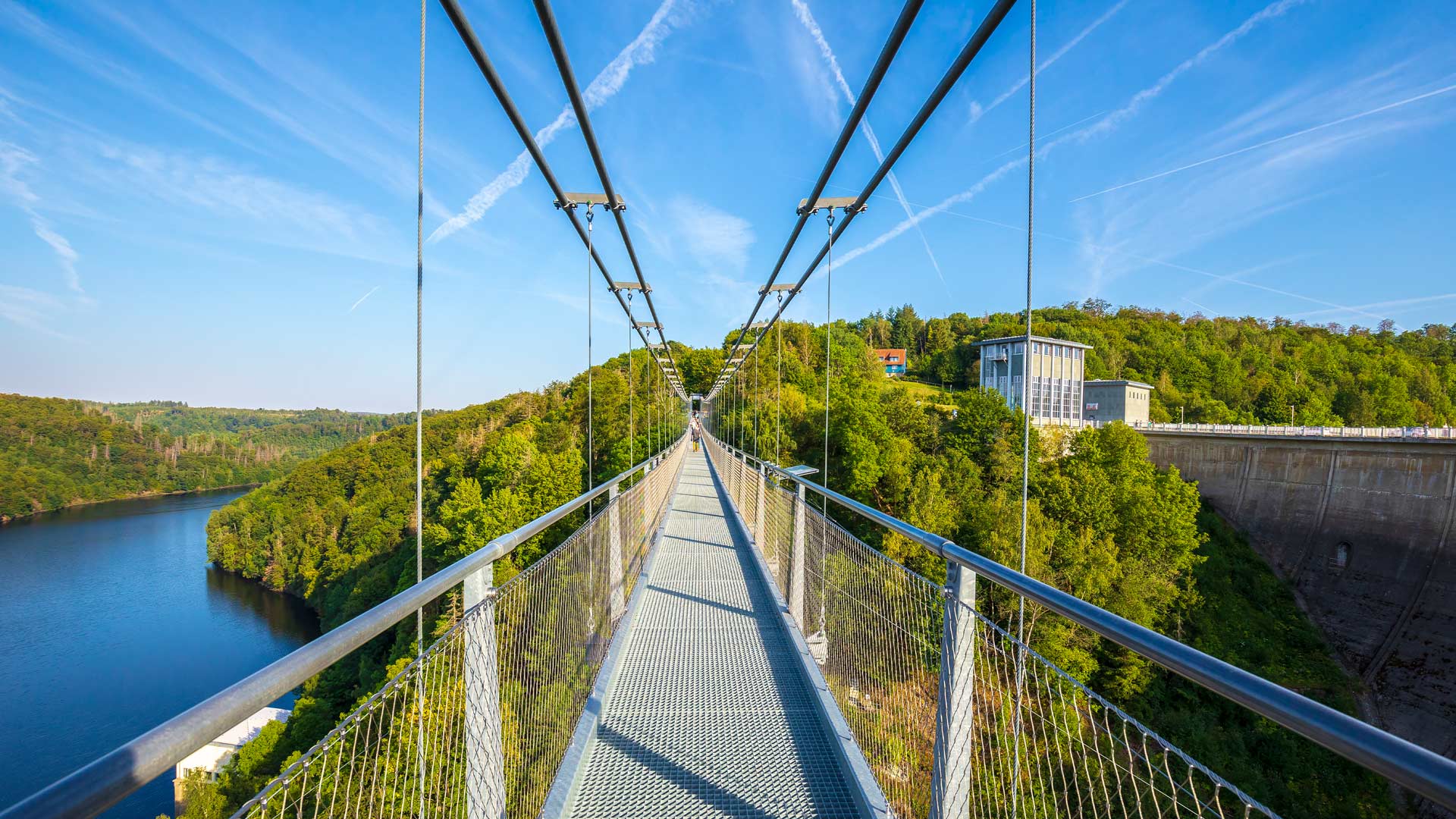 Erleben Sie einen Nervenkitzel der besonderen Art auf einer der längsten Fußgängerhängebrücken der Welt - der Titan RT an der Rappbodetalsperre im sagenumwobenen Harz. Schwebend über dem beeindruckenden Rappbodetal verbindet das 483 Meter lange architektonische Meisterwerk die steilen Felswände des Nationalparks und bietet einen atemberaubenden Ausblick, den sonst nur Vögel genießen können. Spüren Sie das leichte Schwanken unter Ihren Füßen und den Wind, der die Kraft der Natur spürbar macht.