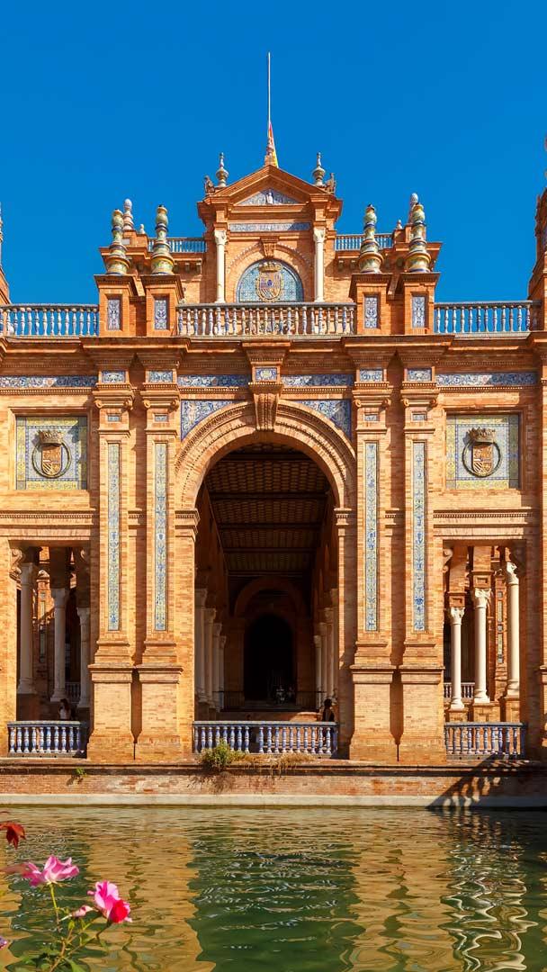 Admiremos la belleza de la Plaza de España en Sevilla, corazón de Andalucía, declarada bien de interés cultural, con su majestuosidad semicircular, sus torres que rozan el cielo y rodeada por un canal cruzado por puentes.