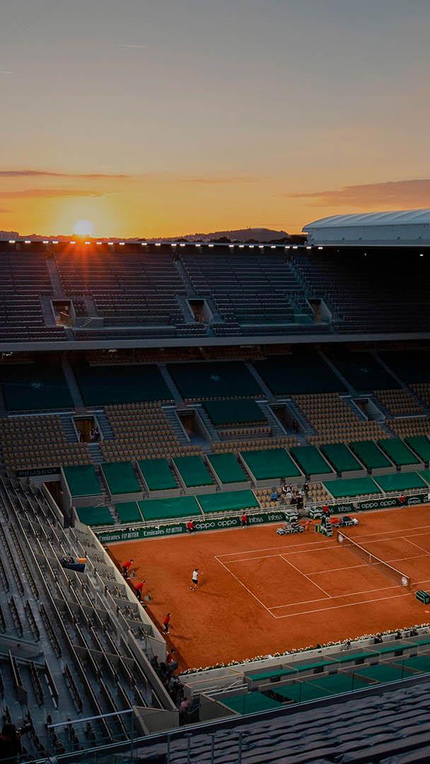 À vos raquettes ! Coucher de soleil sur le court Philippe Chatrier, Roland-Garros, Paris (© Juergen Hasenkopf/Alamy Stock Photo)