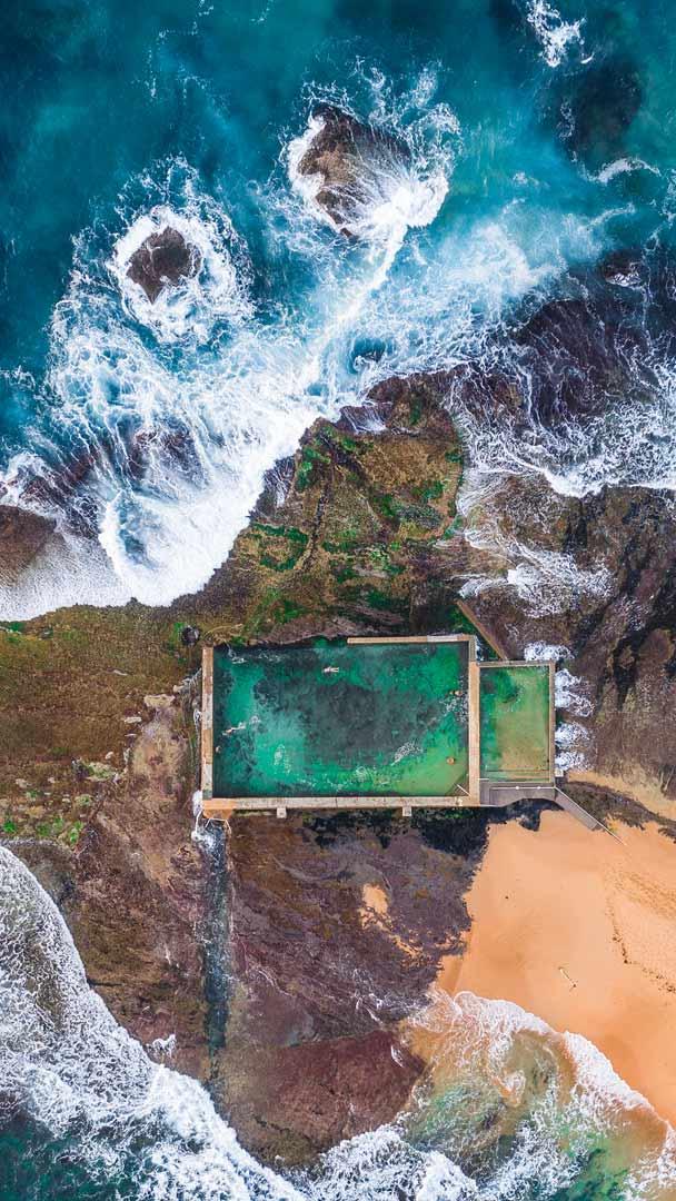 À la lisière de Sydney en Australie, la piscine naturelle de Mona Vale s’offre comme un tableau vivant : creusée dans une dalle rocheuse, bordée par l’océan Pacifique et les rouleaux d’écume. Construite dans les années 1930, pendant la Grande Dépression, elle fut conçue dans le cadre d’un programme de secours à l’emploi, à l’image des initiatives sociales menées en Europe à la même époque. Le bassin principal mesure près de 30 mètres de long et côtoie une piscine pour enfants.