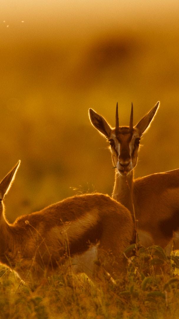 Dans la lumière dorée du Maasai Mara, au sud-ouest du Kenya, une mère gazelle veille. À ses côtés, son faon hésite encore entre candeur et vigilance. Cette gazelle de Thomson, l’une des plus rapides d’Afrique, peut atteindre les 80 km/h. Mais en cet instant suspendu, tout semble paisible.