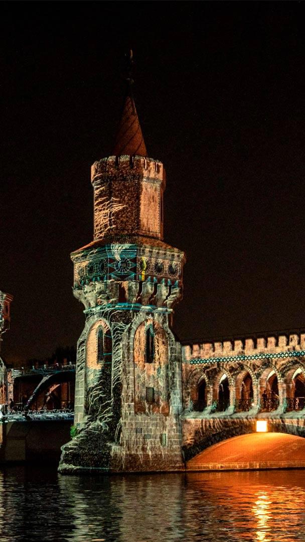 Le pont de l’hiver du monde Le pont de l’Oberbaum illuminé pendant le festival des lumières de Berlin (Festival of Lights), (© John MacDougall/AFP via Getty Images)
