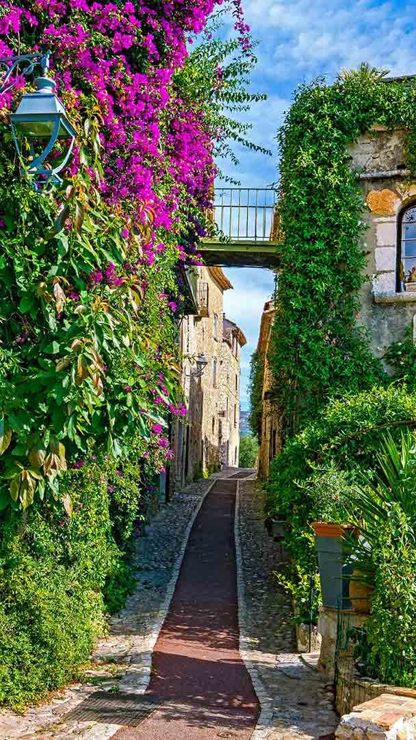 Un art de Provence Allée fleurie à Saint-Paul-de-Vence, Alpes Maritimes, Provence-Alpes-Côte-D’azur (© Susanne Kremer/Huber/eStock Photo)