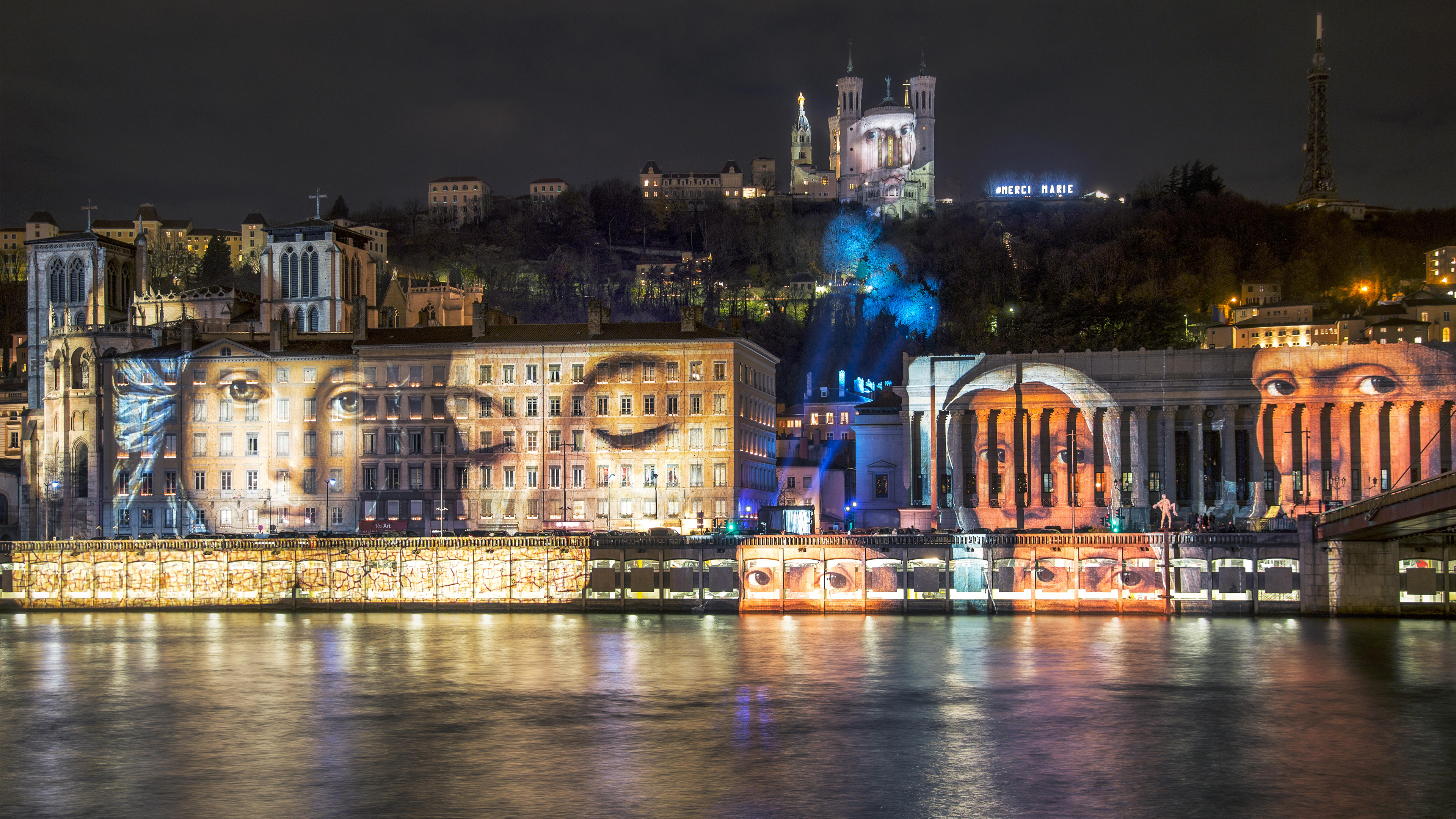 Plongez au cœur de la magie lumineuse de la Fête des Lumières de Lyon, une célébration envoûtante où l"art rencontre l"émotion. La photo du jour illustre l"œuvre captivante de Daniel Knipper, « Regards », qui a illuminé la colline de Fourvière en hommage aux victimes des attentats du 13 novembre 2015.