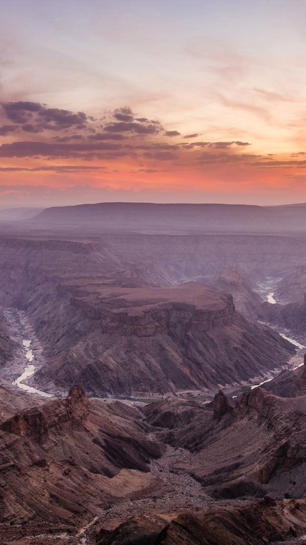 Que ce soit pour explorer le désert du Namib, le plus ancien du monde, ou pour s’émerveiller devant la forêt de Quiver Tree, la Namibie, située dans le sud de l’Afrique, offre des paysages sans pareil. La Fish River, la rivière la plus longue du pays, a sculpté le plus vaste canyon d’Afrique au fil de millions d’années.
