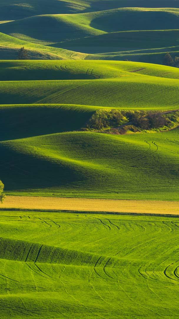 Wave after wave of velvety hills stretch across the Palouse. This tranquil region lies in southeastern Washington in United States, extending to the borders of Idaho and Oregon. The wheat-covered slopes shift in colour with every passing season. In spring, the hills turn lush shades of green as young wheat and barley begin to grow, while summer transforms them into dry, golden browns as the crops near harvest.