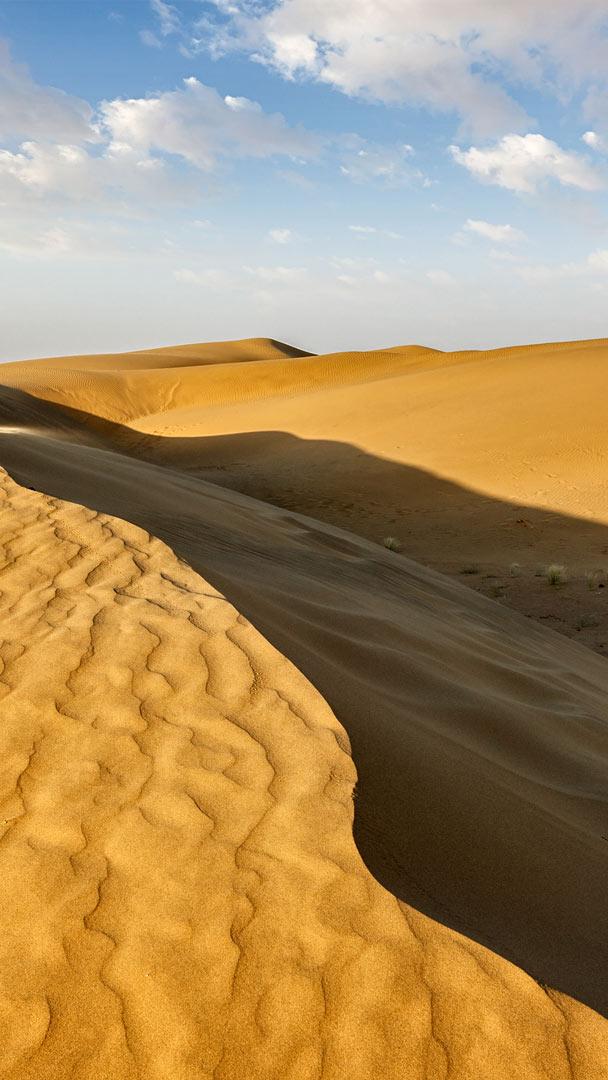 At first glance, the Thar Desert looks like a sea paused mid-motion. Its sand dunes rise and fall in long, flowing ridges, shaped entirely by wind and time. Fine grains of sand are constantly lifted and resettled, creating slopes that shift subtly with each season. Spread across western Rajasthan, these dunes define the Thar"s rolling terrain, their warm tones deepening under the desert sun and changing character by the hour.