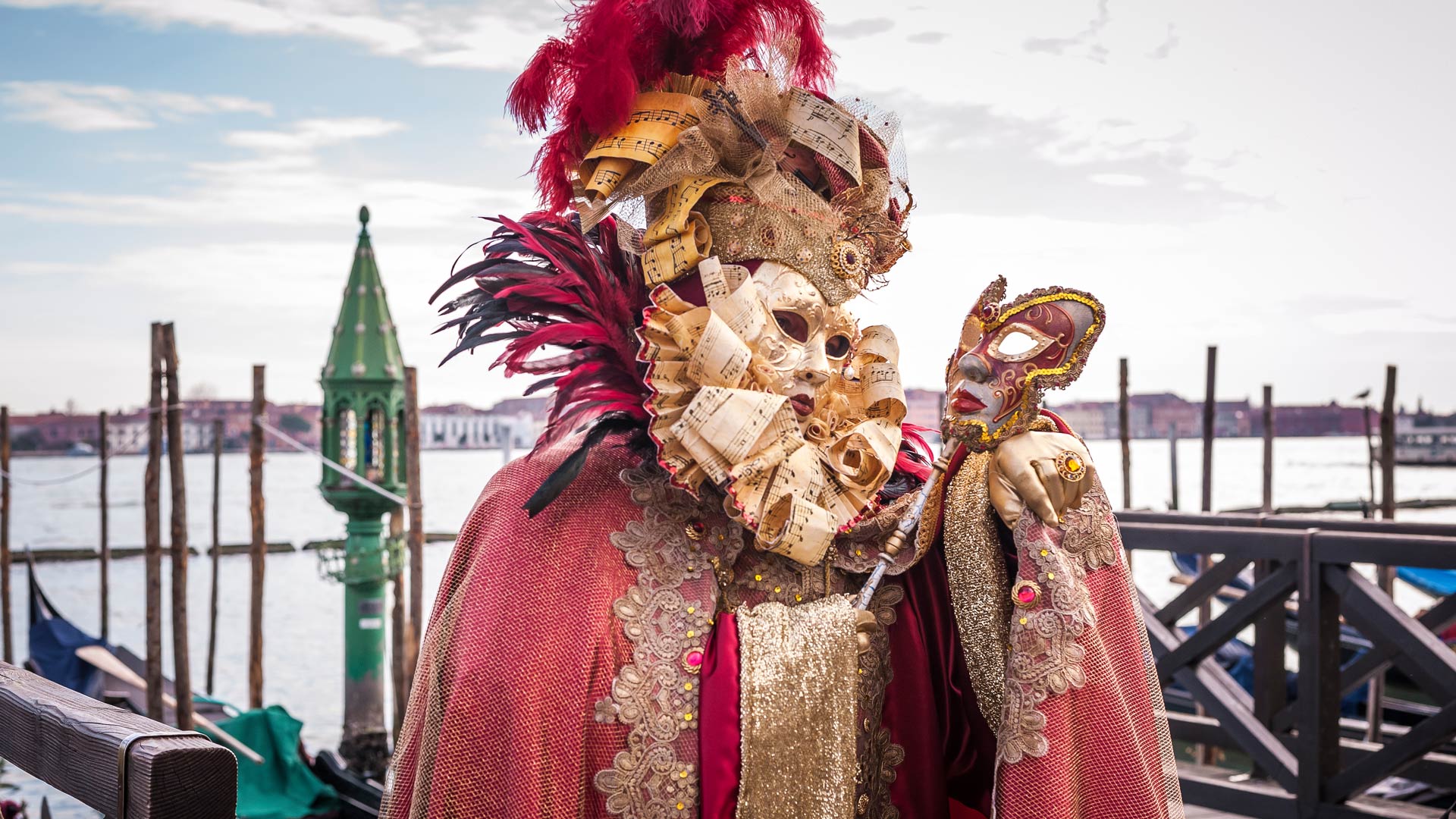 Che la Festa abbia inizio! Maschera veneziana con gondole sul retro, Venezia, Veneto (© Chiara Cattaruzzi Photography/Moment/Getty Images)