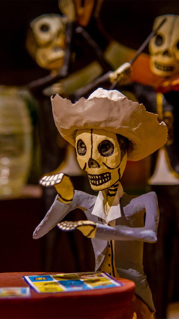 Cosa festeggiano questi scheletri? Scheletri (calacas) travestiti per le celebrazioni del Día de los Muertos in Messico (© Amelia Fuentes Marin/Getty Images)