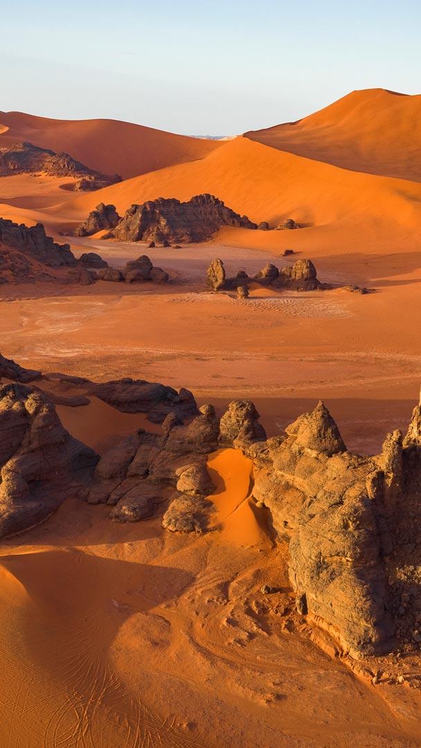 サハラ砂漠の岩層と砂丘 © Airpano/Amazing Aerial Agency