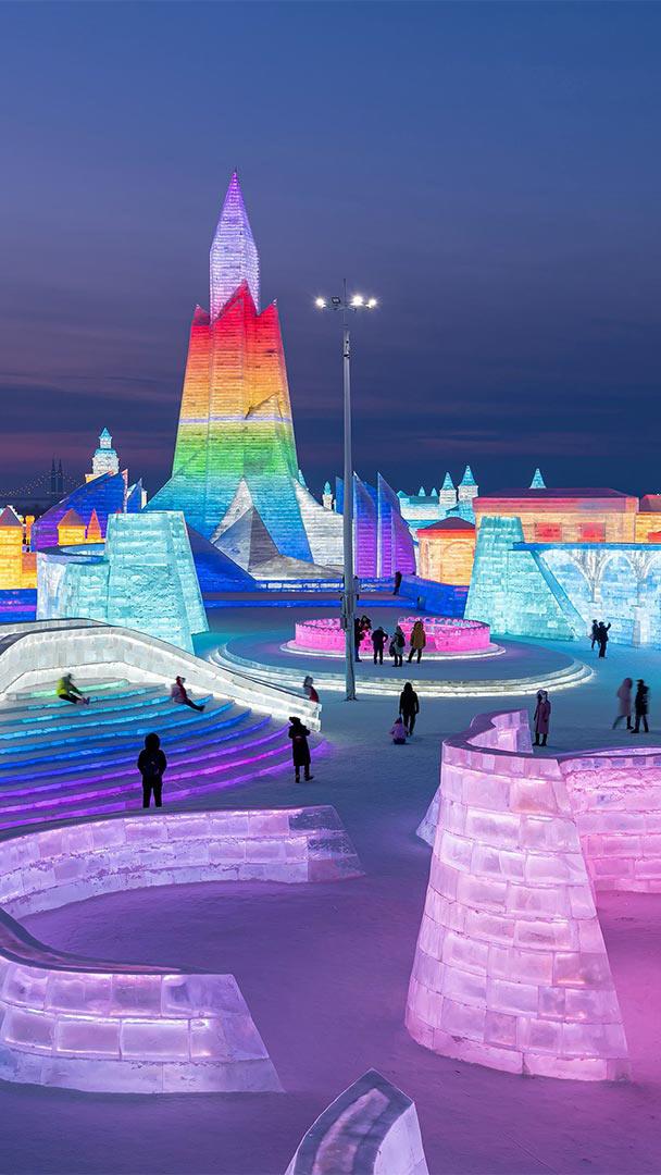 ハルビン 氷の町のライトアップ ハルビン氷祭り, 中国 黒竜江省 (© STR/AFP via Getty Images)