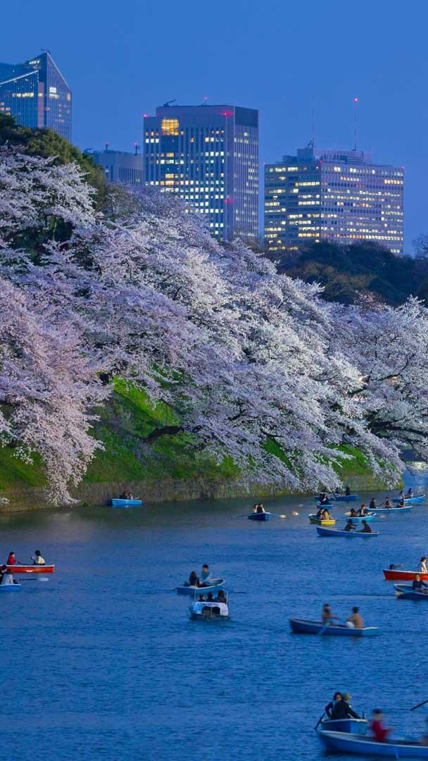 Stop and smell the Sakura Cherry trees in full bloom near the Imperial Palace with Tokyo Tower in the background, Tokyo, Japan (© Jon Arnold/Danita Delimont)