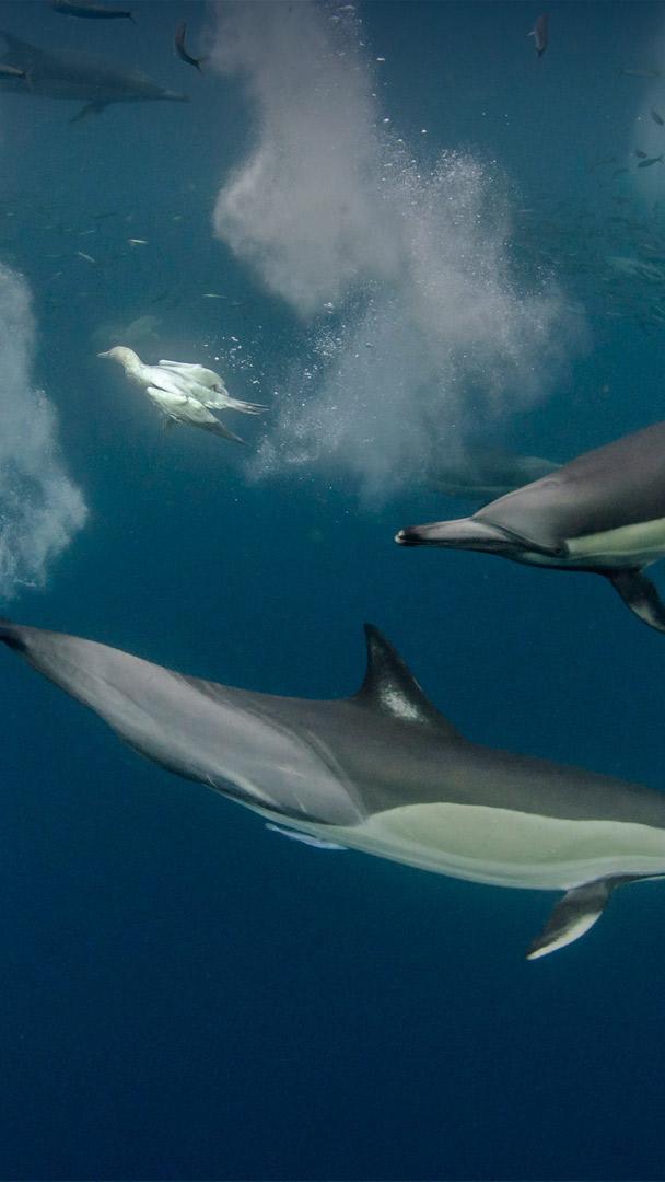 The buffet is open Long-beaked common dolphin pod and diving Cape gannets hunting Pacific sardines off the Eastern Cape, South Africa (© Pete Oxford/Minden Pictures)