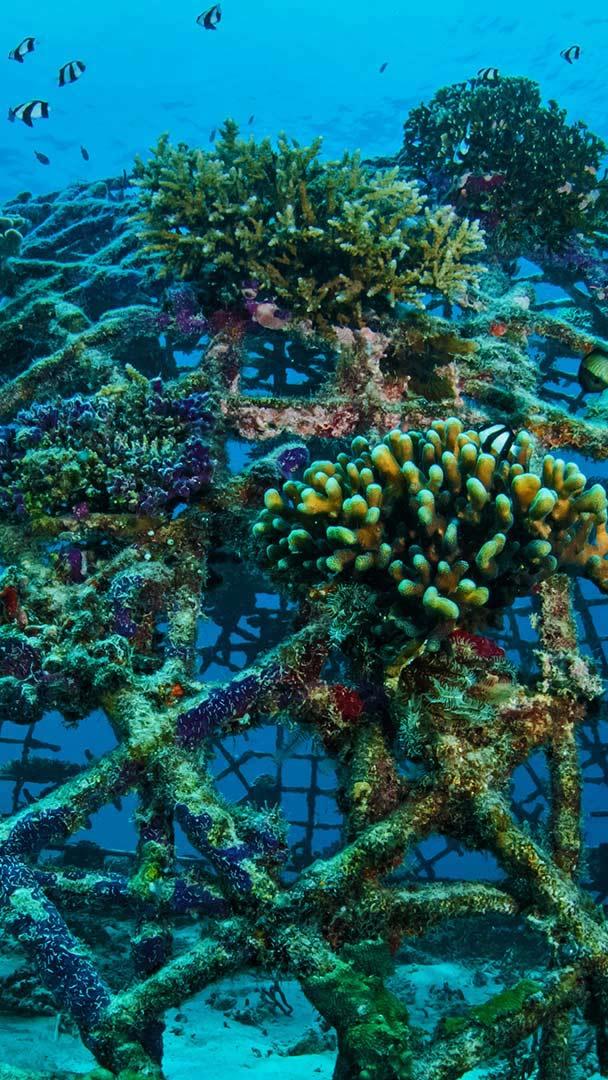 Humans have been trying to construct artificial coral reefs since at least the 1950s, with only marginal success. But in 1979, German scientist and inventor Wolf Hilbertz created ‘Biorock,’ also known as ‘Seacrete.’ Hilbertz found that by directing a low-voltage charge to a metal frame submerged in seawater, calcium and other minerals in the water would build up on the frame. This mineral coating is so similar to the mineral composition of natural reef substrate that it creates a good habitat for the growth of corals. After the minerals have begun to coat the surface, divers transplant coral fragments from other reefs, attaching them to the structure’s frame. These coral pieces begin to bond to the accreted mineral substrate and start to grow, typically faster than in natural environments. Eventually the reef looks and functions like a natural reef ecosystem rather than an artificial one.