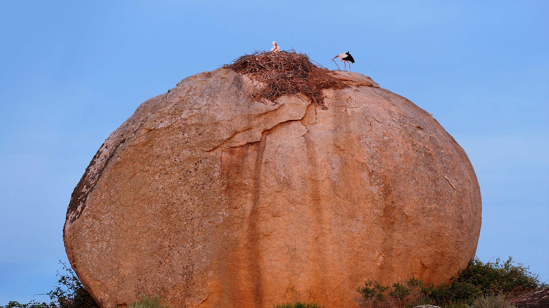 It’s migration season for white storks, shown here tending to a nest at Los Barruecos Natural Monument in central Spain. This destination is known for large, granite boulders intermixed with sculptures created by local artists—and it’s a favorite stork nesting spot. When the storks arrive here in springtime for their nesting season, the area can be filled with the sound of the storks’ loud bill-clattering, a tap-tap-tapping that can be heard from great distances. In August and September, white storks depart their nests for a 25-day trip south to their African wintering grounds, where they gather in large flocks. The species returns to Europe again nine months later—hence its unique role in folklore, giving parents a low-stress way to answer the question ‘where do babies come from?’