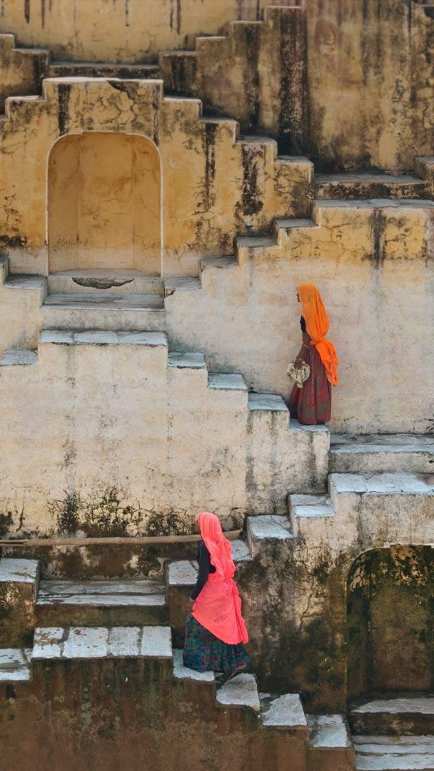 The stepwell that these women are climbing is an apt image to mark World Water Day. Stepwells originated in western India over a thousand years ago as way for locals in that arid climate to easily and reliably access fresh water—even during the driest months. The Panna Meena Ka Kund stepwell in Jaipur is a classic example of the beautiful, regular, geometric architecture used to produce these useful public works. Most stepwells also feature shaded side chambers where locals (primarily women) can gather to escape the heat of the day.