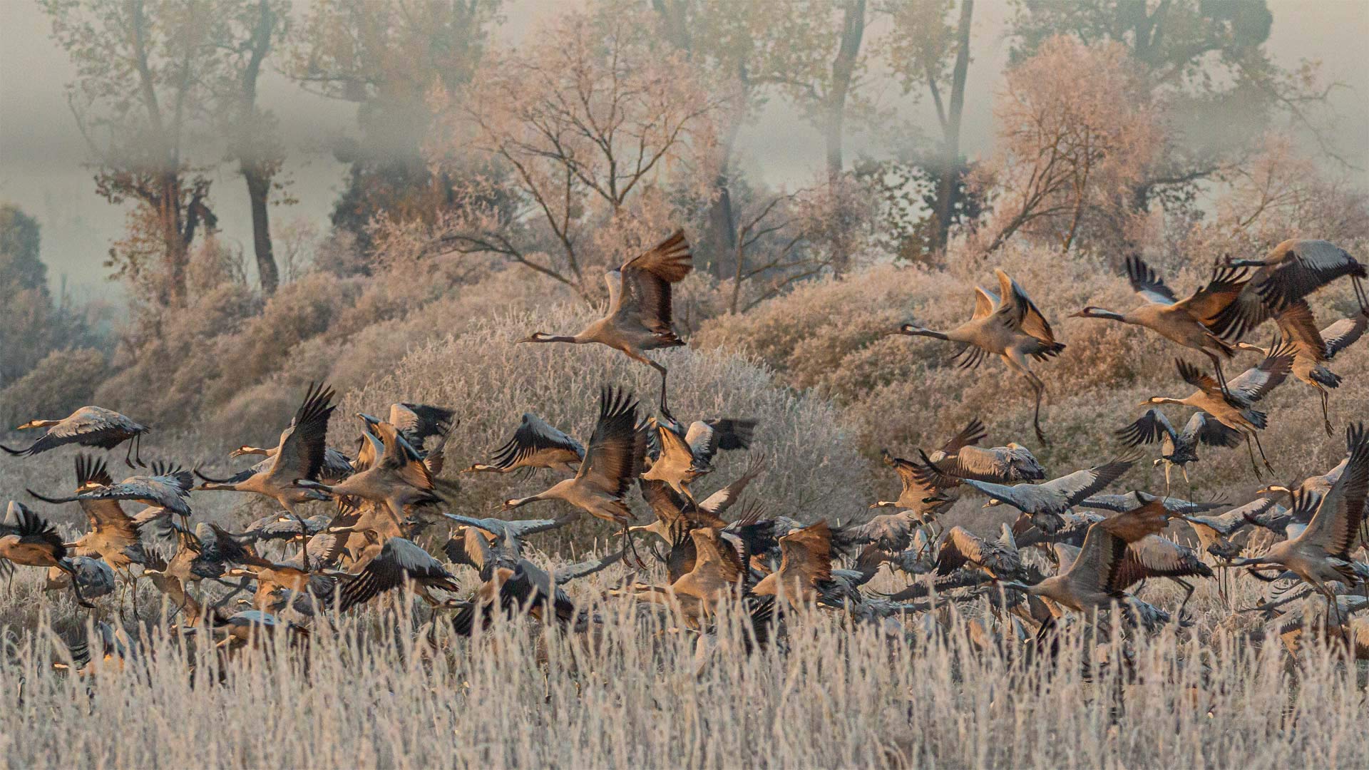 Common cranes (aka Eurasian cranes) often gravitate to wet open fields, bogs, and marshes. This flock is congregating in the Drömling wetland in Germany. The most widely distributed of all the 15 species of cranes, its native range covers a wide swath of Europe and Asia, with the largest breeding populations in Russia and Scandinavia. As winter approaches, common cranes make the long journey south, often in large flocks of about 400 birds, to North Africa or parts of southern Europe and Asia in search of more civilized temperatures.
