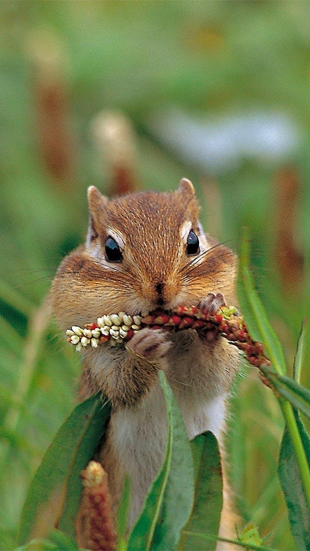 The Siberian chipmunk is the only species of chipmunk found outside of North America. Its native habitat ranges from across Russia to northern China, Japan, and Korea. Though Siberian pine nuts are a favorite meal, these little rodents will eat nearly anything—seeds, fruits, insects, even small birds and lizards. Our ravenous friend here in Hokkaido, Japan, is gorging on inflorescences, or clusters of flowers. A chipmunk can stuff a surprising amount of goodies into its cheek pouches, which can stretch to three times its head size—imagine how ridiculous we"d look if our stomachs were as forgiving.