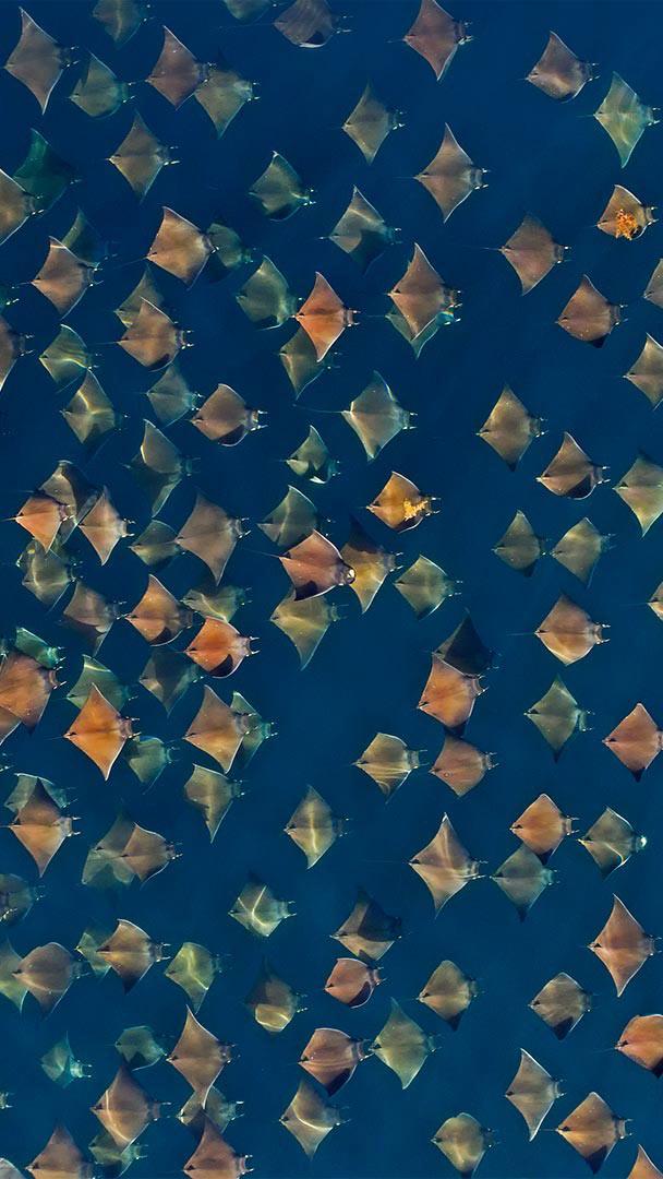 The feeding frenzy is on! Each spring and fall, the waters off Mexico"s Baja California Peninsula become the perfect place to spot Munk"s devil rays in massive schools like this one. Unlike stingrays (and perhaps the devil), devil rays lack fearsome pointy tails. In fact, these fish are pretty gentle all around, feeding mainly on plankton. And for them, mealtime is party time: During huge devil ray gatherings like this, rays are seen continually bursting out of the water and landing with loud bellyflops.