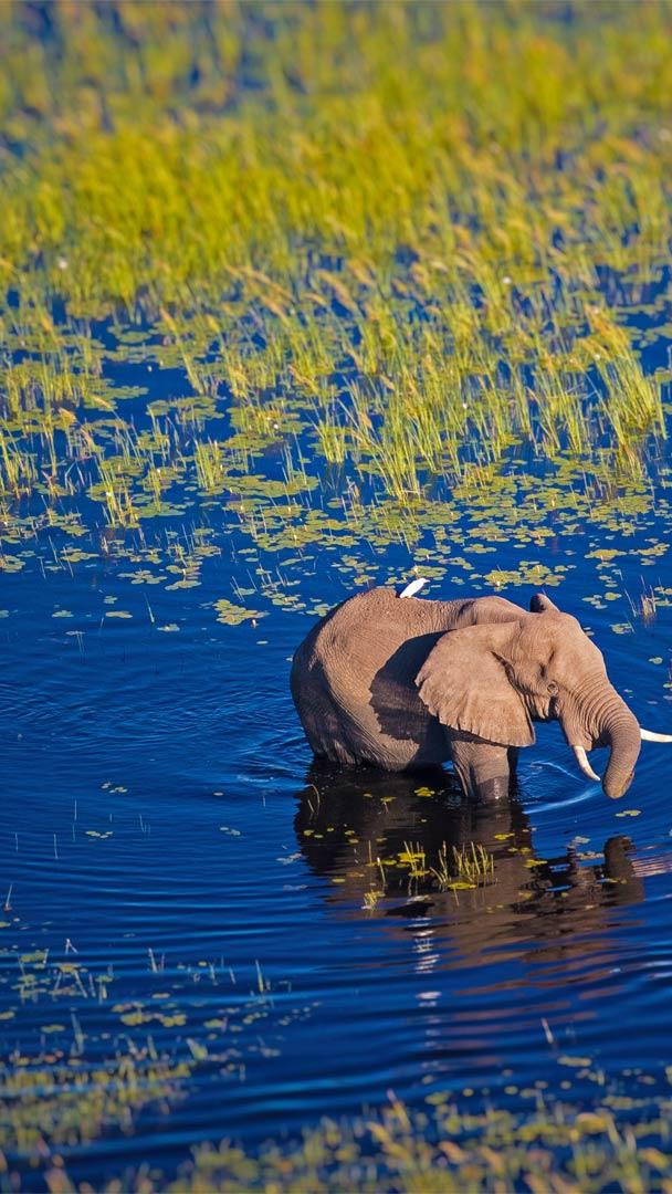 At a glance, this might look like some ordinary swamp, but the Okavango Delta in the African nation of Botswana is a veritable miracle of nature. Unlike most rivers, the Okavango River doesn"t drain into any sea or ocean, but rather empties into the open savanna. Thousands of elephants, and just about every other type of African animal you can name, owe their existence to this annual wetland. "Annual," because the marshland of the delta swells threefold to its full size but once a year, between March and July, when the seasonal rains from the highlands of Angola flow downhill 750 miles until they flood the arid savanna of northwest Botswana. The wildlife drawn to this life-sustaining water includes lions, leopards, cheetahs, rhinos, giraffes, zebras, hippos, wildebeests, hyenas, crocodiles, impalas, and of course elephants, the planet"s largest land animals.