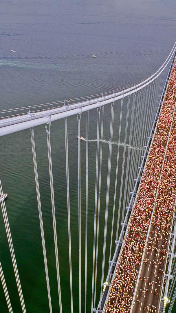 The route for the 2022 New York City Marathon starts right here at the Verrazzano-Narrows Bridge, crossing from Staten Island into Brooklyn and eventually coursing through all five boroughs of New York. This photo gives you an idea just how many people will be running today. Because the race starts early on a November morning, many runners show up in layered clothing to beat the typical chill. But once they heat up from running, those layers come off and are often discarded on sidewalks. Race organizers collect the activewear left behind by 50,000 runners, about 26 tons a year, and donate it to charity.