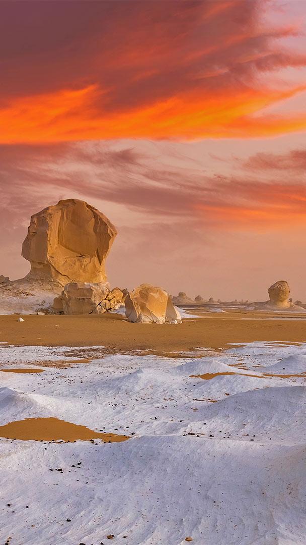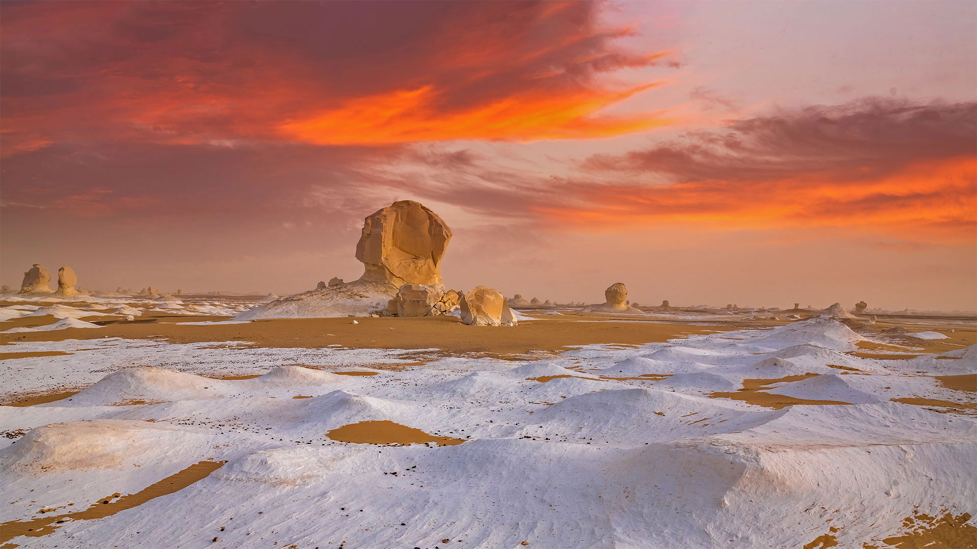 Snow, in the desert? Not quite. Today we"re in Egypt"s White Desert, which gets its colorful name from an abundance of chalk, limestone, and quartz rock formations that give the sand its special hue. Tourists flock to this place to see these naturally occurring structures, honed over thousands of years into unique shapes through a process known as differential weathering. Located about five hours to the southwest of Cairo, White Desert National Park is a lot more than just deteriorating rocks—it"s also a protected refuge for several endangered animal species.