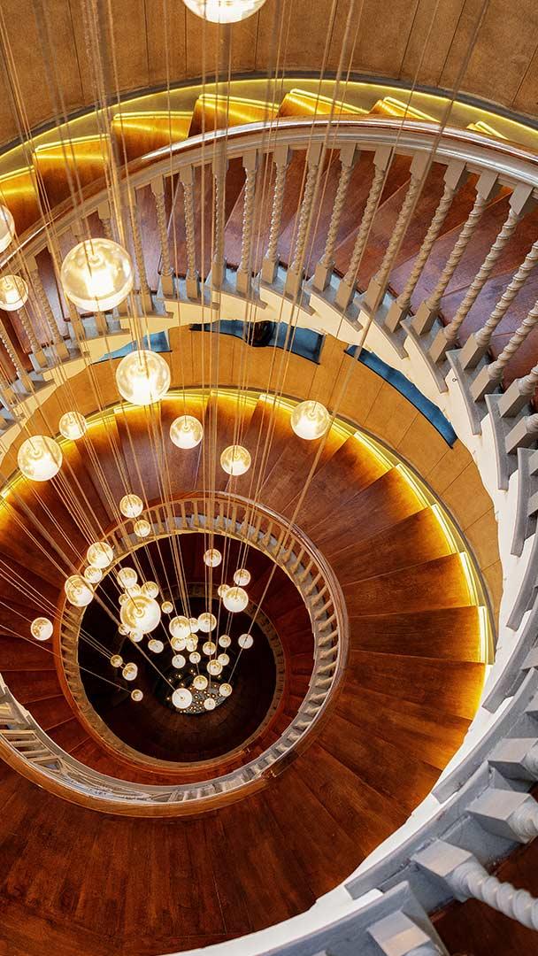 This stunning staircase spirals up through three floors at Heal"s department store in central London, where it has been helping shoppers get around in stylish fashion since 1916. It was designed by architect Cecil Brewer ahead of the opening of an in-store art gallery. While the gallery no longer exists, the Cecil Brewer Staircase remains a popular part of the store"s heritage, particularly with photographers looking to capture a little London glamour. The lights at the outer edge of the stairs were added after World War II, and the elegant chandelier cascading from top to bottom was installed in 2013. If you visit, keep an eye out for a bronze cat on a windowsill overlooking the stairs, the store"s not-for-sale official mascot.