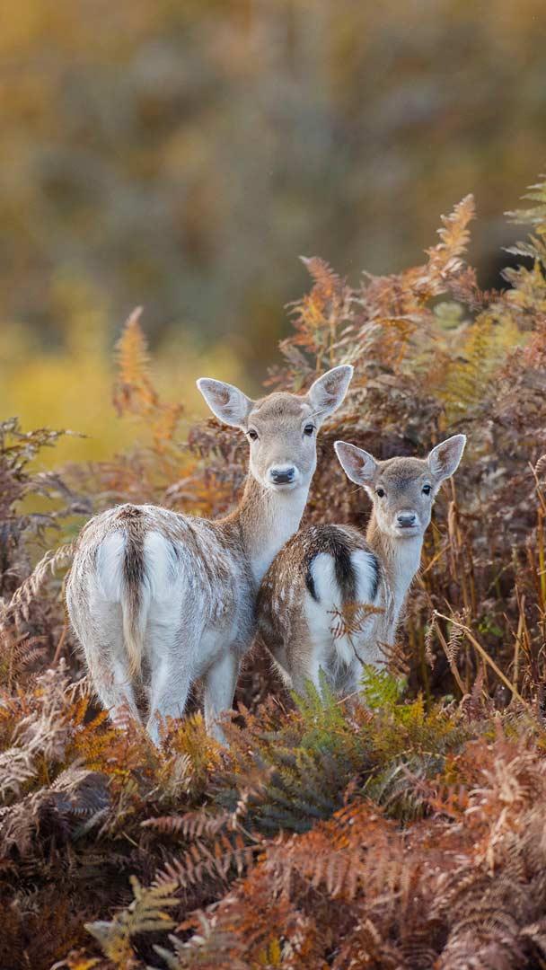 This doe and fawn are fallow deer, known for their striking chestnut brown coats with white spots, which typically darken to gray in the winter. Fallow deer are native to Europe and parts of Asia and are a common sight in England, where they were introduced by the Normans in the 11th century. During the autumn rutting season, mothers stay close to their young while the males, which have broad palmate antlers, spar to establish their dominance. Our homepage doe and fawn are pictured in 850-acre Bradgate Park in Leicestershire, a medieval deer park set within woodlands and a beautiful landscape in England"s East Midlands region.