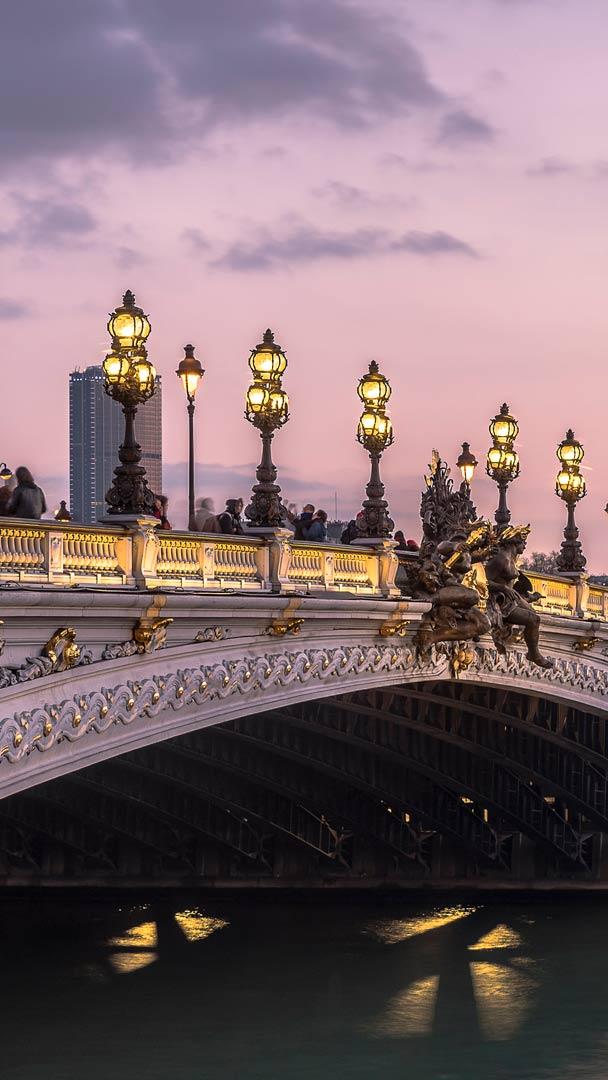 The "golden hour" just before sunset is the perfect time to take in views of Paris" most ornate bridge, the Pont Alexandre III. Arching over the Seine, the bridge was opened in 1900 and named after a Russian tsar, celebrating a new alliance between the two countries. Befitting the nobility of the event, two 56-foot columns sit on each bank of the river, crowned with gilt-bronze sculptures of the winged horse Pegasus. From the center of the bridge, standing above reliefs decorated with nymphs and beneath Art Nouveau-style lamps, you can admire some famous Parisian monuments. Views include the Esplanade des Invalides, the Grand Palais and Petit Palais museums, and the Eiffel Tower.