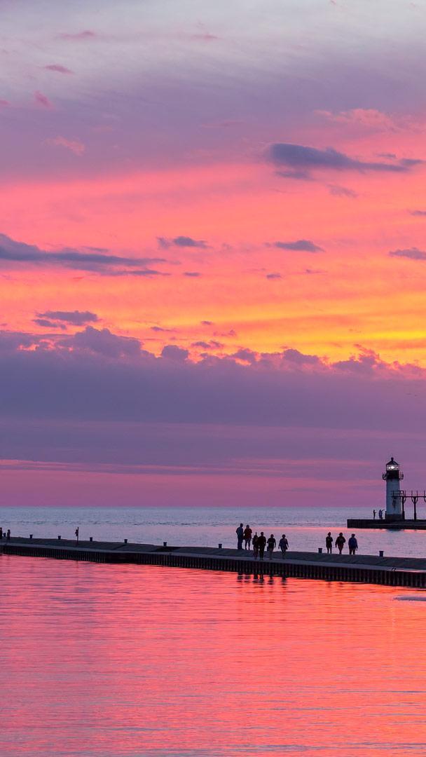 Amid dusky hues, lighthouses mark where a Great Lake meets a river. Two piers were built on Lake Michigan, one either side of the mouth of the St. Joseph River to help protect ships sailing upstream. In the early 20th century, a lighthouse was built at the end of each pier; the St. Joseph North Pier Inner and Outer Lights, pictured here.