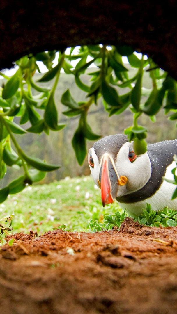 Atlantic puffins spend most of their lives at sea—either flying over the surf as they migrate and search for fishing spots, or diving into the water to gobble up fish. But in spring and summer they come ashore to nest, meet up with their mates, and with any luck, raise a chick or two. Puffins can dig their own burrows, as they prefer to build nests underground atop seaside cliffs. But if there are rabbit warrens around, the puffins have no problem moving into empty burrows. They’re not even above kicking a rabbit out to take over.