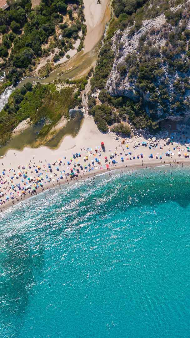 The island of Sardinia in Italy, with its rugged cliffs, secret beaches, and endless shades of blue, is undeniably a Mediterranean treasure. On the island"s eastern coast lies Cala Luna, featured here—a beach in the Gulf of Orosei. Rising at the mouth of Rio Illune, this beach is at the end of the Codula di Luna canyon. It is a haven of golden sand, surrounded by white cliffs that rise more than 950 feet into the sky—perfect for rock climbing.