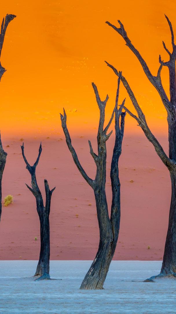 At first glance, it looks like a surreal art installation: dark trees frozen on a clay pan, backed by sand dunes and a glowing sky. But this scene from Deadvlei, in Namibia"s Namib-Naukluft Park, is entirely natural. The name "Deadvlei" means "dead marsh"—a remnant of the wetland that once filled this basin.