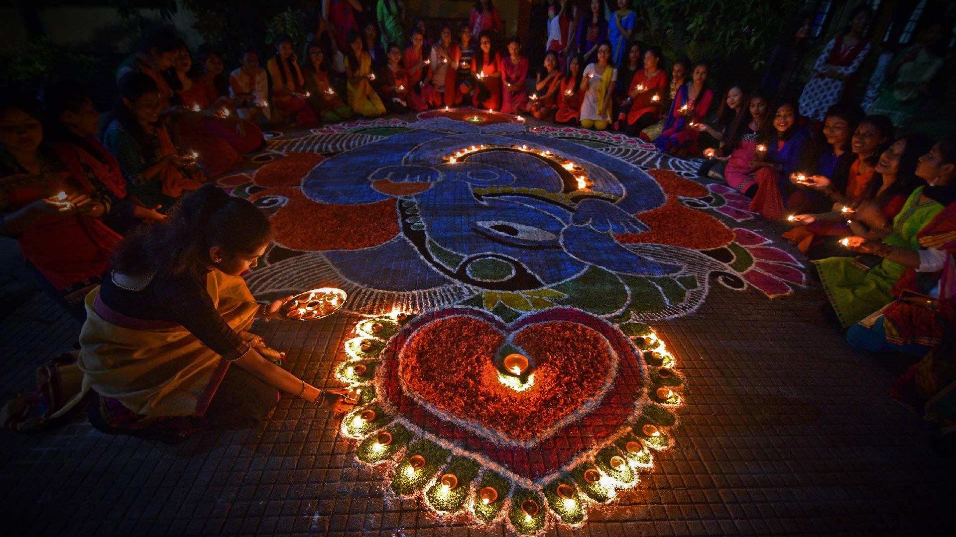 These students in Guwahati, India, are lighting oil lamps called diya, and placing them around a floor decoration called rangoli. They’re preparing for Diwali, a five-day celebration symbolizing the victory of light over darkness. It’s a Hindu festival, but Sikhs, Jains, and Newar Buddhists also observe variations of Diwali. Many homes, temples, and commercial spaces decorate with lights, especially diya. The rangoli decoration is thought to bring good luck, and is created by hand using colored rice, flours, sand, or sometimes flower petals. Diwali lasts until November 11, so there’s still time to embrace the light.