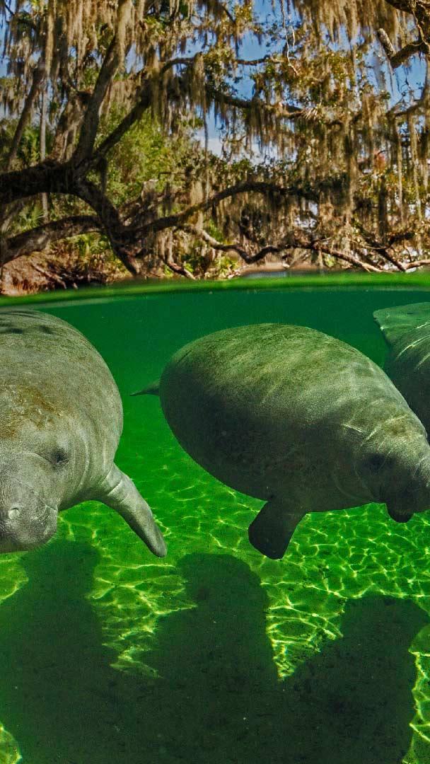 We’re in Florida’s Blue Spring State Park for Manatee Awareness Month. As winter approaches, Blue Spring becomes a safe harbor for manatees, aka sea cows, looking for warmer inland waters. It’s also a protected area for the manatees, where they can eat and swim without fear of injury from boats. In fact, researchers identify many of the manatees in Blue Spring by the scars they bear from accidental boat collisions and motor blade cuts. Identifying individual manatees has been crucial to tracking the population rebound of this once endangered species. A 2016 census of manatees in Florida’s springs counted 6,250 of the large, surprisingly graceful beasts.